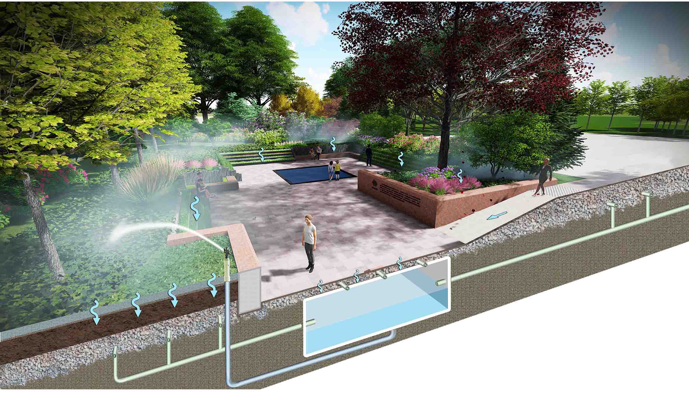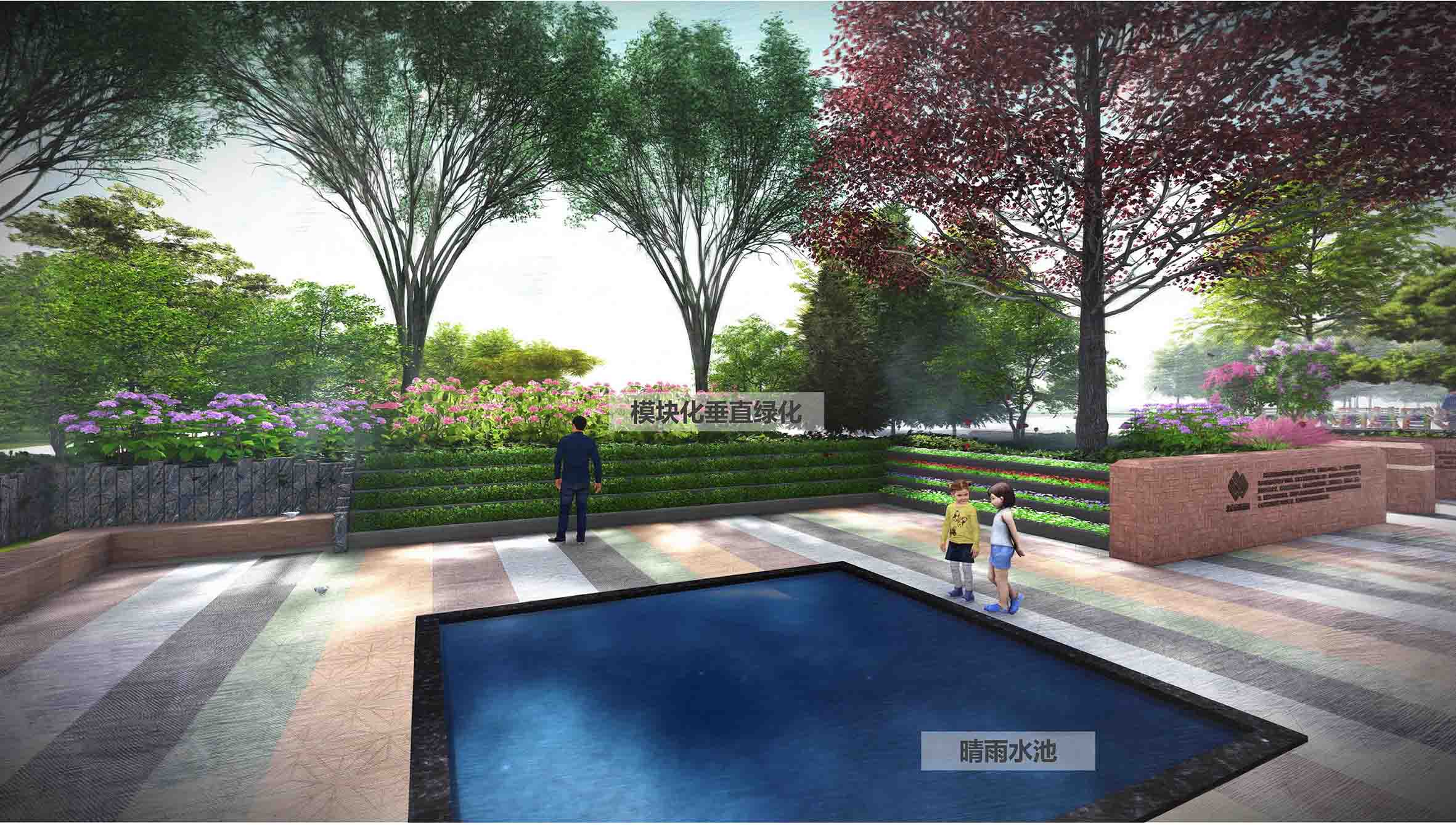 京彩未来花园采用下沉式设计,以京彩燕园最优质的符合"乡土""长寿""抗逆""食源""美观"等标准的大规格精品容器苗木、最高品质的工程技术为基础,以智慧生态景观创新为特色,利用海绵城市的雨水回收及利用系统为园区灌溉及景观供水,采用太阳能作为自产清洁电力能源,采用环保新型材料"生态石"为主材,采用自发光强透水铺装材料,打造出集生态化、环保化、科技化、智慧化、彩色化、芳香化六元一体的、代表未来园林发展方向的京彩未来花园。